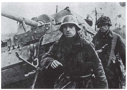 在坦克的支援下,一群德军步兵正在准备进攻行动。