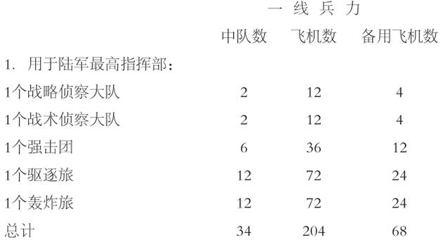 在动员期之初,设想有5个军、2个摩托化师和2个骑兵师,航空兵部队的编制如下: