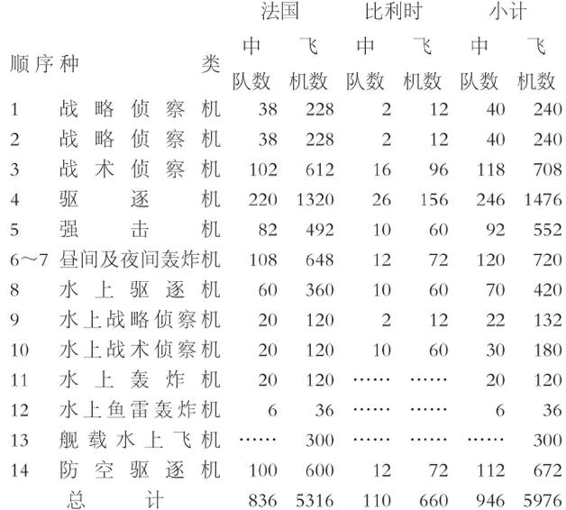 在首次动员后,比利时航空兵部队的总兵力如下表:
