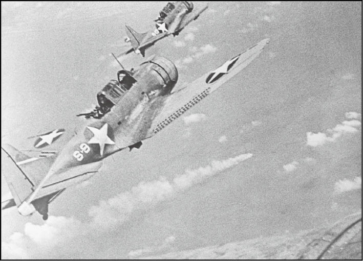 1942年6月,在中途岛[213]海战中的美国海军“无畏”式俯冲轰炸机。