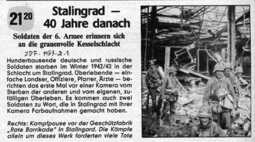 在斯大林格勒战役结束整整40周年的1983年2月1日和2月2日,德国电视二台和电视一台,分别播出了“斯大林格勒——40年后”(Stalingrad-40 Jahre danach)和“斯大林格勒——一个悲剧的纪年”(Stalingrad-Chronik einer Tragödie),各有说明:“第6集团军士兵回忆那悲惨的包围战”和“40年前保卢斯将军指挥的第6集团军投降了。”