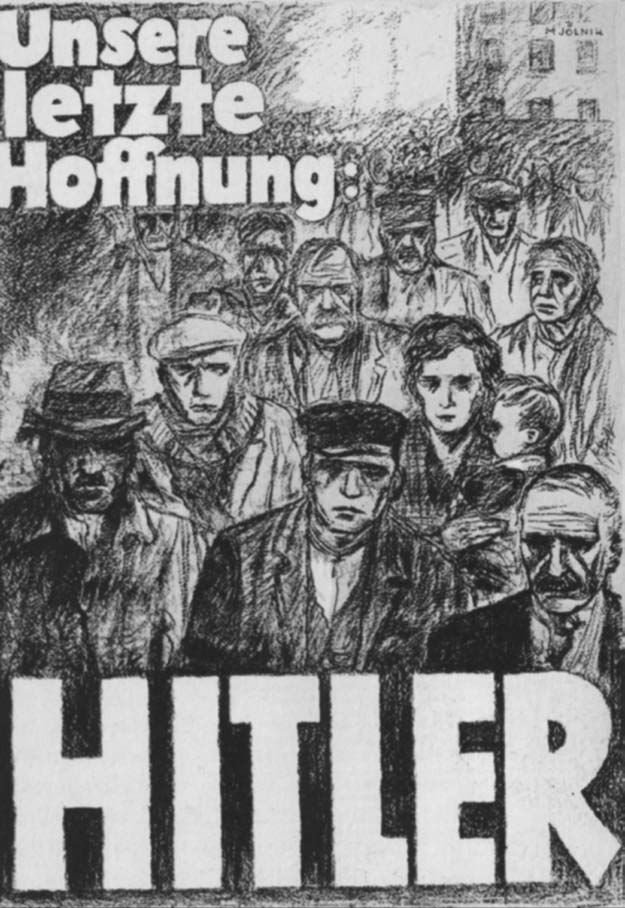 在德国中学历史教科书上,有1930—1932年间德国几个主要政党的竞选招贴画。在共产党的竞选招贴画上,有一群“绅士”围坐在会议桌旁议论国是,一个工人扬起手臂,下面是竞选口号:“结束这样的制度”。社会民主党的招贴画中,左翼的共产党和极右翼的纳粹党都成为“民主的敌人”。纳粹党的招贴画上则是一群面容憔悴、神情失望的人,文字很简单:“我们最后的希望:希特勒”。