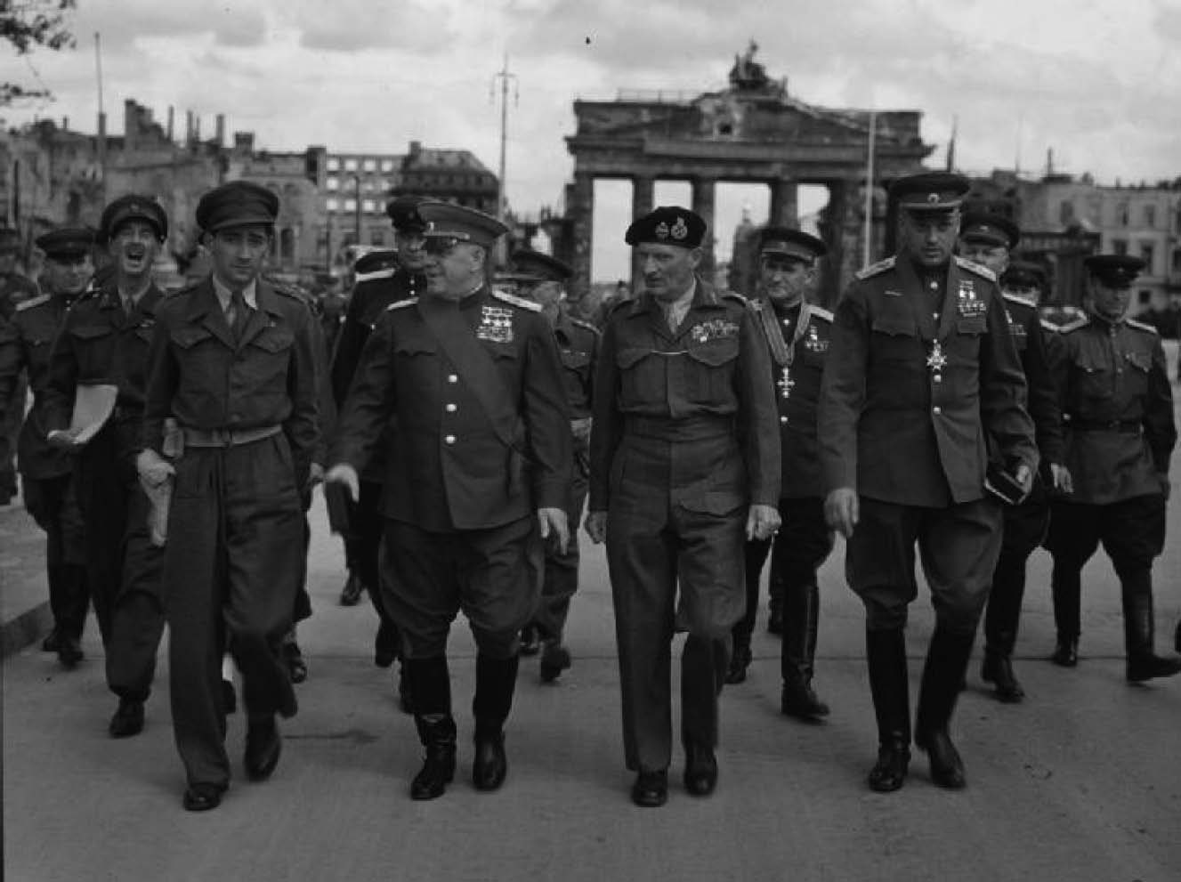 1945年7月12日,蒙哥马利(前排右二)与朱可夫(前排左二)、索科洛夫斯基、罗科索夫斯基等人在柏林勃兰登堡门前