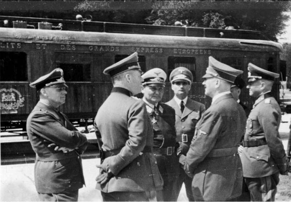 希特勒在巴黎北郊贡比涅森林那节“一战”结束德军签署投降协定的火车车厢前。左起:里宾特洛甫、布劳希奇、戈林、赫斯和希特勒。注意,希特勒和里宾特洛甫身着没有肩章的军装。