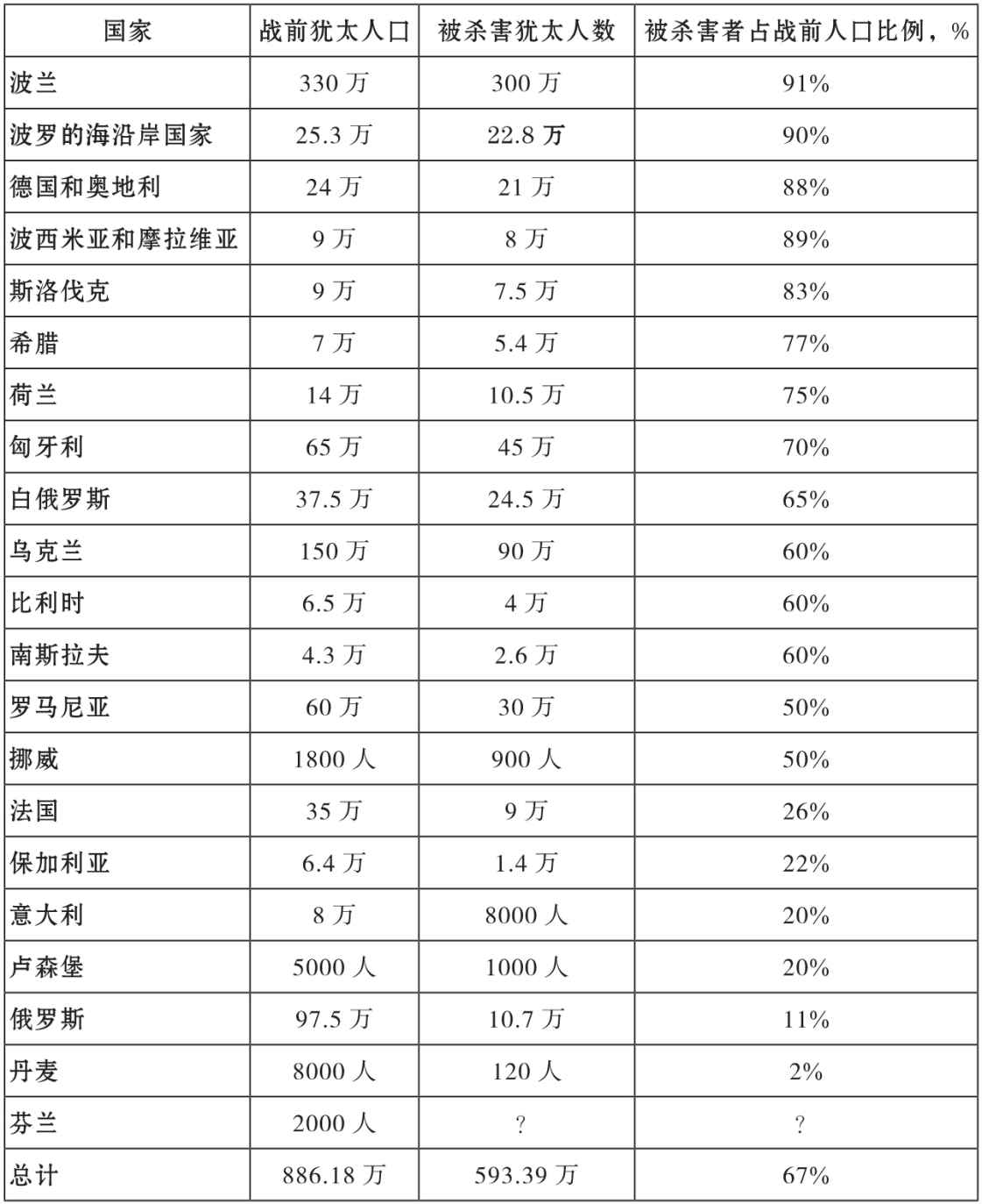 根据各种资料,主要是对犹太历史、尤其是对纳粹“大屠杀”有深入研究的美国犹太女作家露西·达维多维茨(Lucy Schildkret Dawidowicz,1915—1990)1975出版的《针对犹太人的战争,1933—1945》(The War Against the Jews,1933—1945)、美国犹太历史学家劳尔·希尔别格(Raul Hilberg,1926—2007) 1961年出版的三卷本厚达1,273页的巨著《欧洲犹太人之被毁灭》(Destruction of the European Jews),还有以色列犹太人大屠杀纪念馆的资料,纳粹大屠杀的受害者大约为: