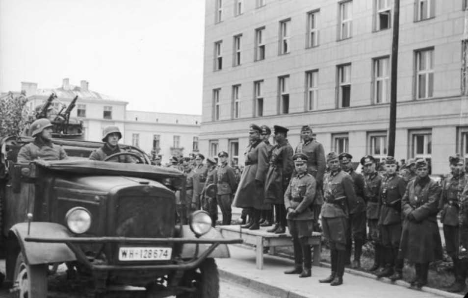 1939年9月22日,德苏两军在布列斯特联合举行阅兵式,台上前排左起第一人古德里安,第二人克里沃先。后排左起第一人德军中将莫里茨·维克托林(Mauritz von Wiktorin,1883-1956)。