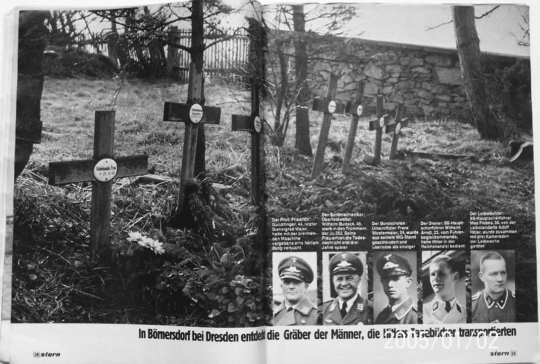 失踪Ju 352飞机的飞行员是弗里德里希·龚德芬格少校(Friedrich Gundlfinger,1900—1945),战争结束时《明星》记者海德曼才13岁,他是从《墓穴》那本书知道龚德芬格这个名字的,但却打听到那位飞行员埋葬在德累斯顿南边一个叫波能斯多夫的小村子里。1980年11月他和周刊编辑托马斯·瓦尔德(Thomas Walde)来到那个村子,小教堂后面见到一块小墓地,在那里见到16座士兵墓,其中七个木十字架中央各有一块牌子,写明死者姓名和死亡日期“21,4,45”,应该就是那架失踪飞机的乘员。在这些名字里有飞行员龚德芬格,随机机械师、空军上士威廉·布达克(Wilhelm Budack),上士尤金·巴斯勒(Eugen Baßler),希特勒贴身侍者阿恩特,随身警卫马克斯·菲伯斯(Max Fiebes)。另外还有两个十字架,牌子写着“45年4月21日不知姓名的妇女”(Unbekannte Frau,21,4,45),看来应该是同机殉难者。两位奉希特勒之命撤离的女秘书并没有上这架飞机,而且她们都活了下来,施罗德后来还写过一本题为《他曾是我的上司》(Er war mein Chef)的回忆录,1986年在维也纳出版,所以这两具女尸至今仍然不知道是谁。