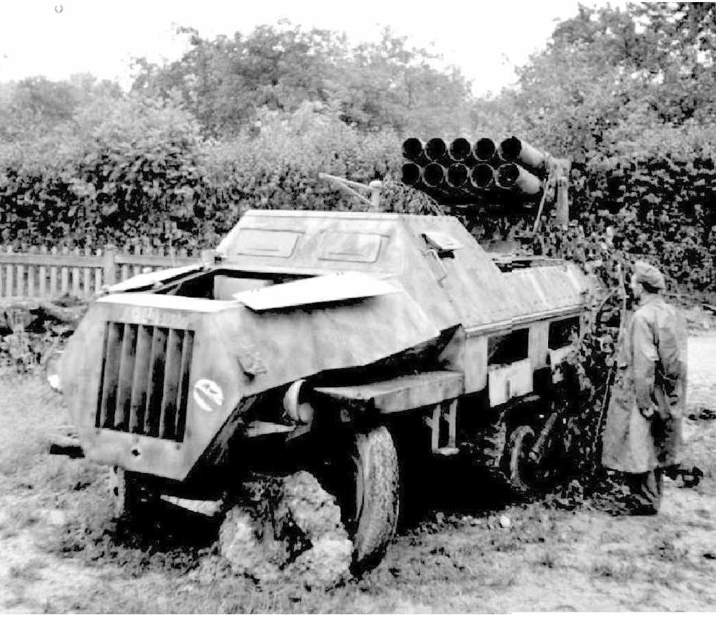 德军遗弃的Sdkfz4型半履带式装甲车,装有42型150毫米火箭发射器。与此同时,凯特尔元帅在下午3点回到了帝国总理府。他对第12集团军进行了巡视后,与约德尔一起去见了希特勒。凯特尔汇报了第12集团军的情况,希特勒听后又相当程度地恢复了信心,相信这次一定会打败苏军。在返回克拉姆普尼兹指挥部途中,凯特尔得知苏军第47集团军正在从西面进攻柏林,而那里的德军早就放弃了抵抗。