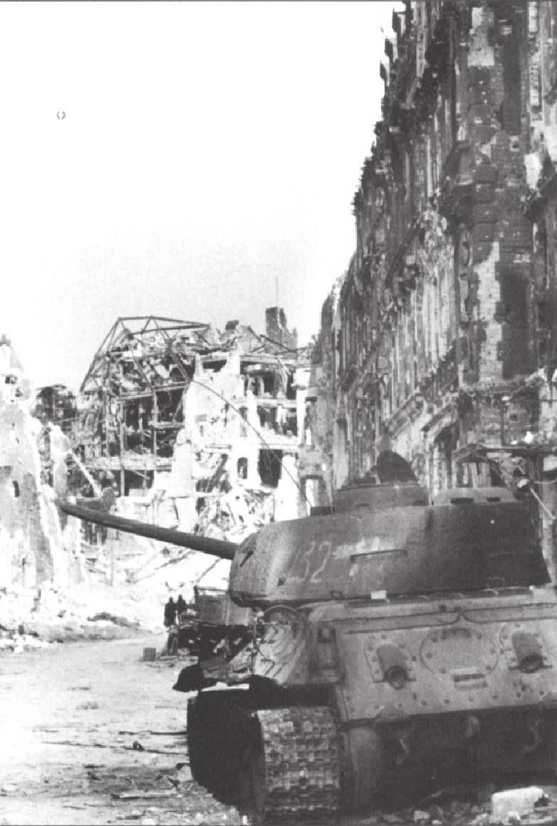 1945年5月,柏林街头彻底烧毁的苏军T-34/85中型坦克。苏军有大约800辆坦克在柏林城内被德军的反坦克火箭筒摧毁。时间:1945年4月28日