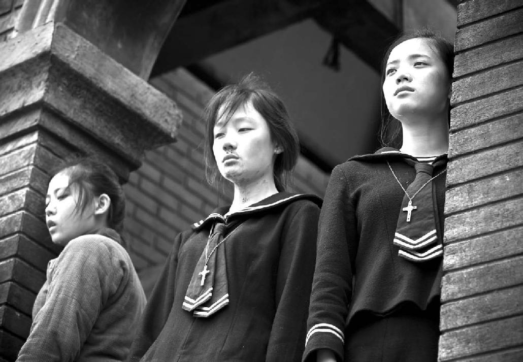 那个年轻的日本女记者和一群日本男女站在露台上,看着远处的大火。他们都披着大衣,大衣下面露出日式起居袍,头发梳成睡觉的发式,显然都是从睡眠中被惊醒的。只有那位在码头上捡传单的年轻日本女子田间雪子仍穿着西服和裙子。