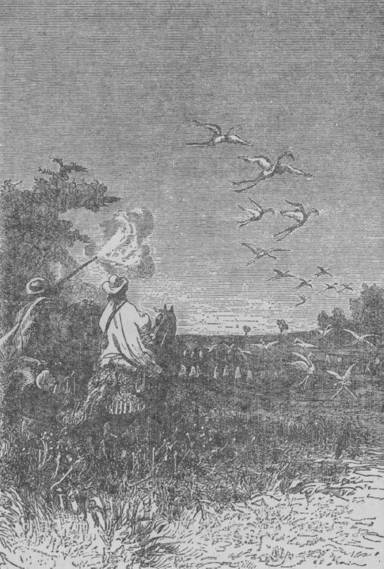 这条南纬37度线穿过许多湖泊和沼泽地,有的湖水咸,有的湖水淡。湖岸上树木丛生,林中千鸣百啭,鹪鹩飞窜,百灵歌唱,云雀与唐纳雀一唱一和,遥相呼应。唐纳雀的羽毛像蜂鸟的羽毛一样美丽。这些美丽的莺类兴高采烈地振羽,吵吵嚷嚷,争风吃醋。荆棘丛中,“安奴比”鸟的窝就像印第安人的吊床一样,悬在微风中摇摆。湖边还有许许多多艳丽的火烈鸟,展开着火红的双翅,迈着整齐的步伐像士兵们一样昂首阔步地行进。林中布满了他们的鸟巢,全在一英尺左右高,成圆锥形。旅行者们打火烈鸟身边而过,它们也不会惊飞,这让巴加内尔大为失望。