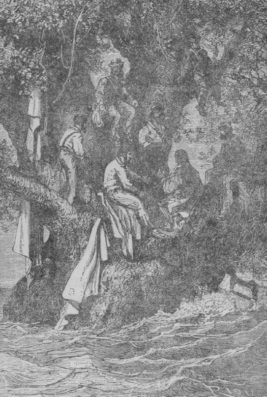 话刚落音,他就像只小猫似的钻进了枝叶深处,威尔逊也随后上去了。巴加内尔找来了一大堆干苔藓,他把这些干苔藓放在“翁比”树干的分叉处,下面铺上一层湿树叶,就这样搭成了一个天然炉灶,也不至于引起火灾。威尔逊和罗伯特很快就回来了,各自拾来一大捆干柴,放在干苔藓上。此时,太阳光正强,巴加内尔用望远镜镜片聚光,一下就将干苔藓点着了。只见巴加内尔像阿拉伯人一样,叉开两条长腿,趴在炉灶上方,一蹲一起,用自己的篷罩扇起风来。一会儿功夫,“炉灶”上就燃烧起了熊熊的烈火。众人围着火堆烤着自己的湿衣服,将篷罩挂在树枝上,随风飘荡。接着开始吃早餐,定量分配,各人一份,因为还得要顾到日后。洪水可能不会像爵士所希望的那样退得快,而干粮有限,“翁比”树又不是果树。幸运的是,树上鸟巢较多,鲜鸟蛋不少,除鸟蛋之外,还可以打鸟吃,吃的问题倒不用发愁。