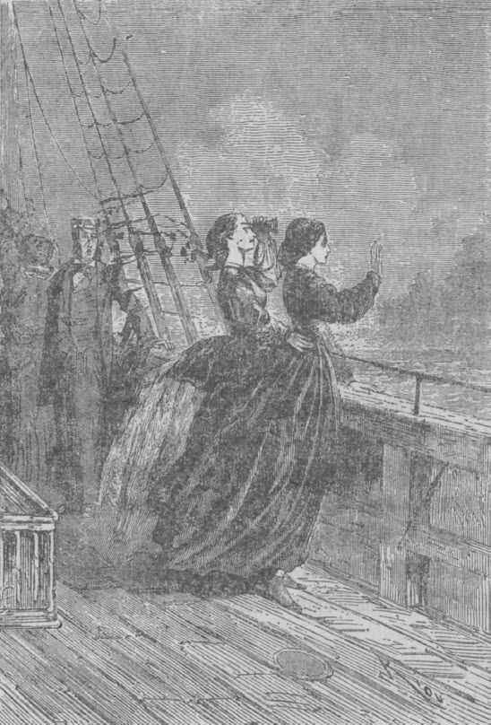 海伦娜夫人和格兰特小姐在尾楼上仔细端详着归来的人们