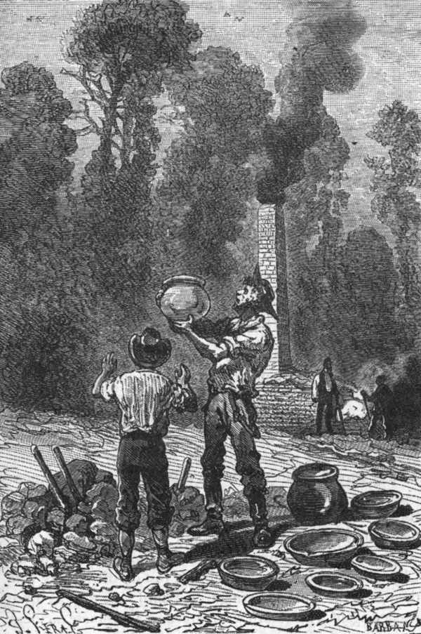 由于时间紧迫,所以他们马上开始砌窑,为焙烧他们日常生活中必不可少的陶器做准备。在此过程中他们并没有遇到太多困难。工程师和他的伙伴们运来了他从红河河口一带露天的地方发现的煤,五天之后,窑里烧起了煤,20英尺的烟囱里冒出了第一缕青烟。林间空地由此变成了一个作坊,潘克洛夫甚至认为这个土窑里可以制造出各种现代化的工艺品,当然,这种想法倒也并不过分。