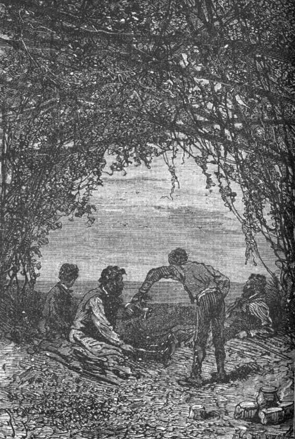 吃完晚饭,他们坐在眺望岗的平台上注视着逐渐昏黑的水平线,纳布给他们沏的饮料是用接骨木种籽制成的,用以代替咖啡。他们漫谈着荒岛以及它在太平洋中的位置,吉丁·史佩莱说:
