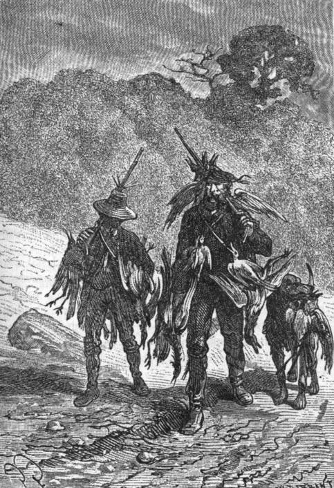 因为在这里上岸很方便,打猎老手赫伯特和吉丁·史佩莱就去游逛了两个来小时,带了好几串野鸭和鹬回来。多亏托普热心而又机灵,他们没有遗失掉任何一只打下来的鸟。