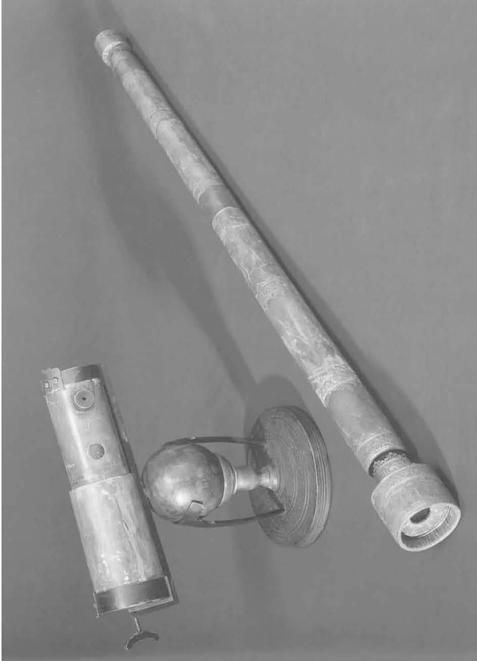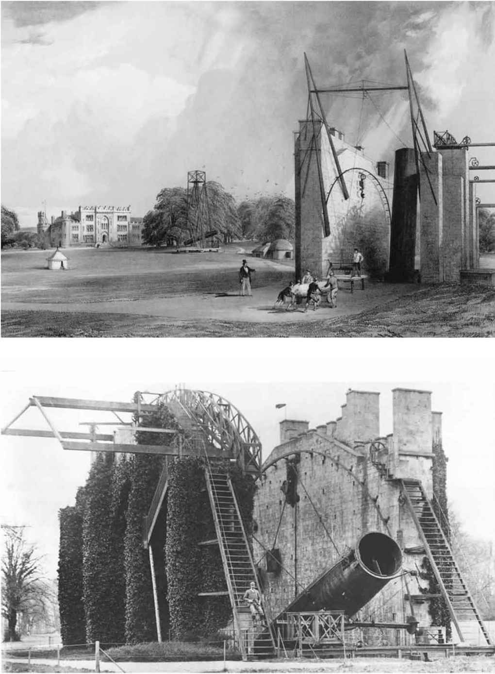 此外,他们还采纳了赫歇尔的组装方法。赫歇尔的望远镜是把从镜筒一端一面倾斜的透镜上反射出的物像直接传到另一端的目镜上。这样,观察人员就不用在镜筒的底端,而是在顶端上,用放大镜往镜筒里面看。这样的装配系统有一个优点,就是不用安装把物像反射到目镜上面去的那面小镜子,这样一来,物像在望远镜里的反射次数就由两次变成了一次,用这种方法光的强度损耗小,物像就更清晰,亮度就更大。这对观察大炮俱乐部的炮弹来说是极有价值的。