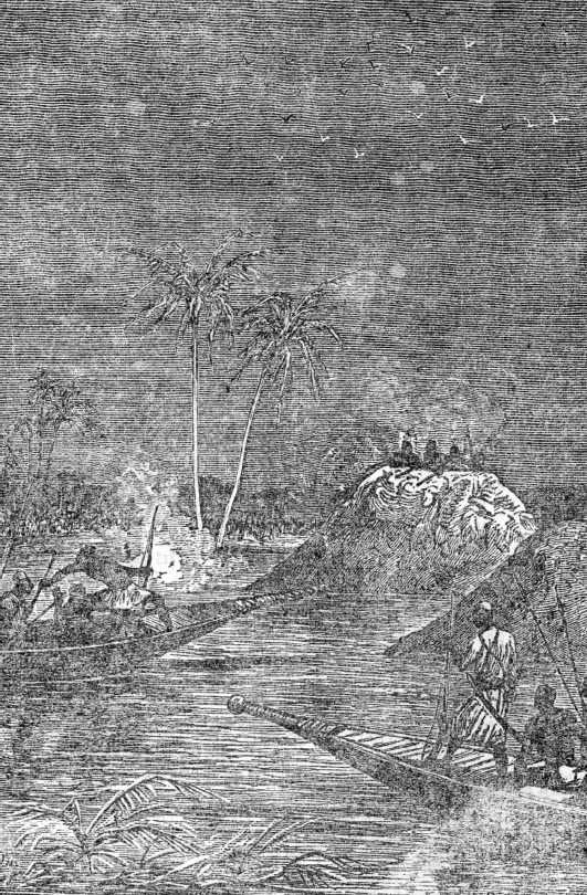 迪克·桑德只说了一句话,便使他的同伴们明白了外面的一切。埃居尔、阿克顿、巴特手握步枪,随着见习水手爬出蚁穴顶部,然后一起向其中一艘长船开枪射击。