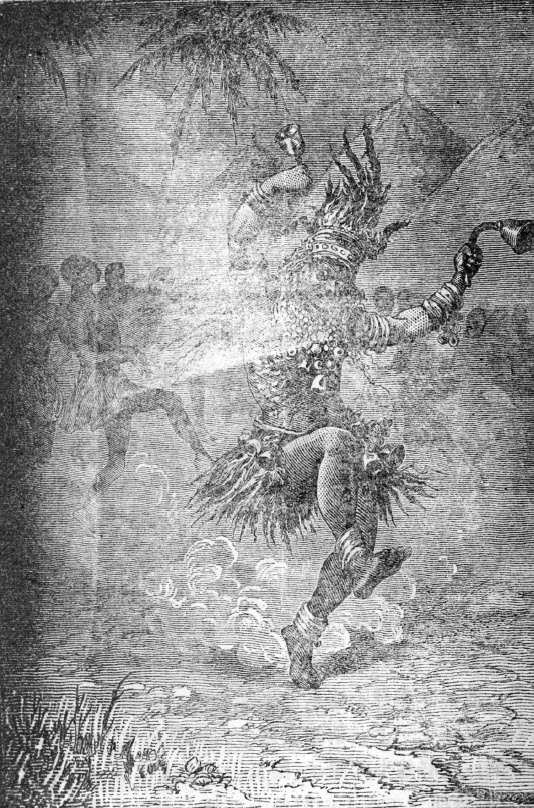 那位非常迷信的女王,可以说此刻已经被这位喜剧演员的表演彻底迷住了,她不由自主地发出一声声尖叫,然后也开始疯狂地随着巫师舞动起来。至于她那些随从、大臣,以及当地的居民也跟着女王狂舞起来。于是,哑巴巫师那长长的喉音,完全淹没在一种由当地语言组成的歌声、尖叫声和嘶号声中。
