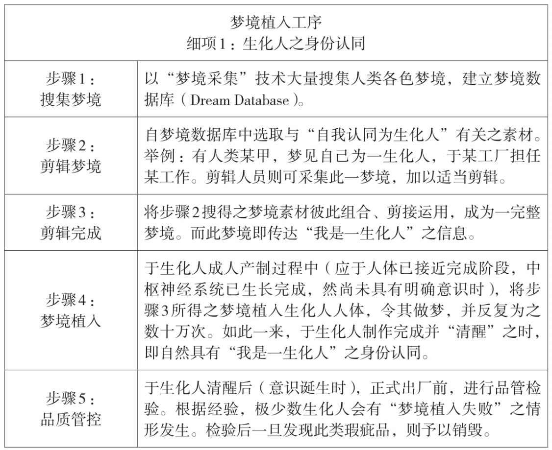 “也因此,人类联邦政府决议将‘梦境净化’纳入生化人梦境植入之制式内容内;换言之,比照一般梦境植入法,将一具有“削减生化人情欲”功能之梦境植入生化人;其意义类同于潜意识去势。生化人经梦境净化后,情欲能力已被剥夺。甚至当他们暴露于与‘爱’或‘性’有关之情境中时,即可能引发身体与情绪上之恶心不适——”
