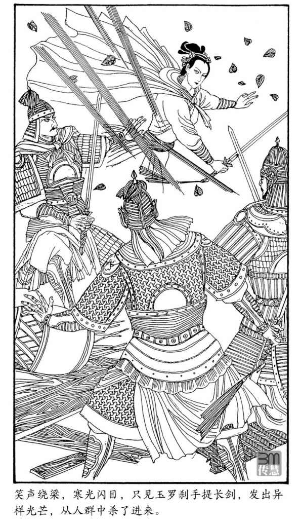 叫喊声中,忽又听得咯咯笑声,十分清脆,笑道:“还有我呢!金老怪,咱们第一次见面,你不赏面赐招吗?”笑声绕梁,寒光闭目,只见玉罗刹手提长剑,发出异样光芒,从人丛中杀了进来,转瞬之间,刺伤了七八名卫士,直杀到核心!慕容冲大怒,反手一勾,玉罗刹一剑扑空,几乎给他击中!剑锋一颤,似左反右,慕容冲也几乎给她刺着,两人换了一招,各自吃惊!玉罗刹为了背腹受敌,笑道:“这样打不好!”反手一剑,将一名卫士刺伤,低头又避过慕容冲一掌,一个旋身,转到岳鸣珂身边,也学着他贴墙作战。岳鸣珂大喜道:“练女侠,快来保卫大帅!”玉罗刹冷冷说道:“我不管你什么大帅,我只要剑谱!”蓦然一跃而出,一剑向金独异刺去!金独异猛发一掌,掌风贯胸,玉罗刹被震迫退了一步,剑锋一转,带守带攻,娇笑道:“唔,果然不错!只是也还不配要我的剑谱!”侧身两记怪招,金独异也给迫得退了两步。
