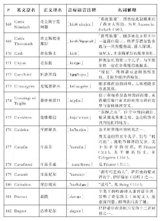 发音参考了大卫·萨洛(David Salo)编写的《辛达语入门》(A Gateway to Sindarin)一书,和露丝·S.诺埃尔(Ruth S.Noel)编写的《托尔金中洲世界的诸语言》(The Languages of Tolkien’s Middle-earth)一书。音标参照其中的说明用国际音标进行标注,和我们许多人学习英语常用的音标习惯略有不同。