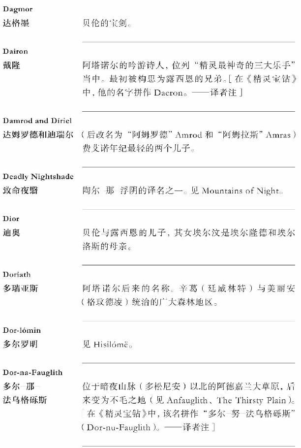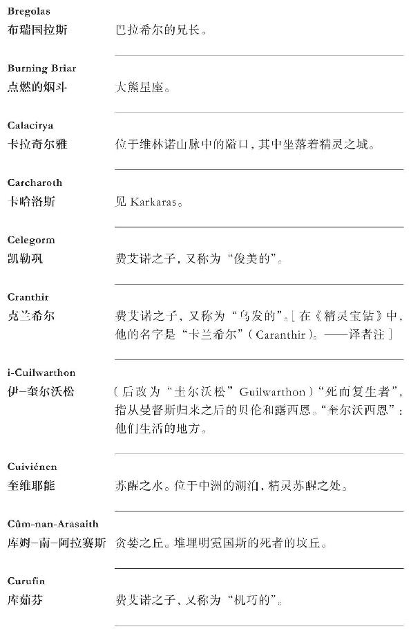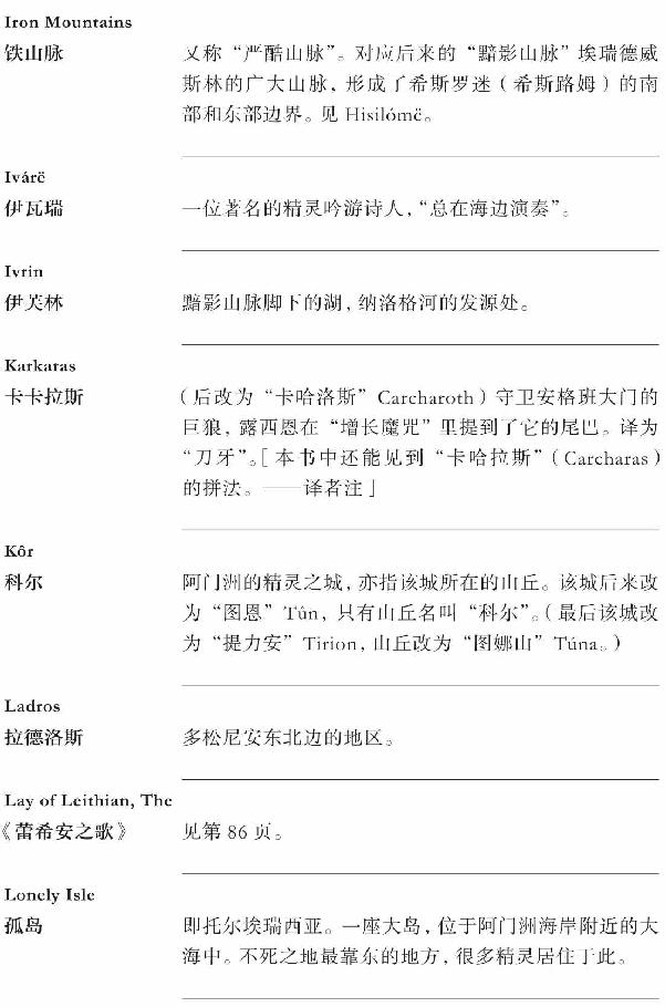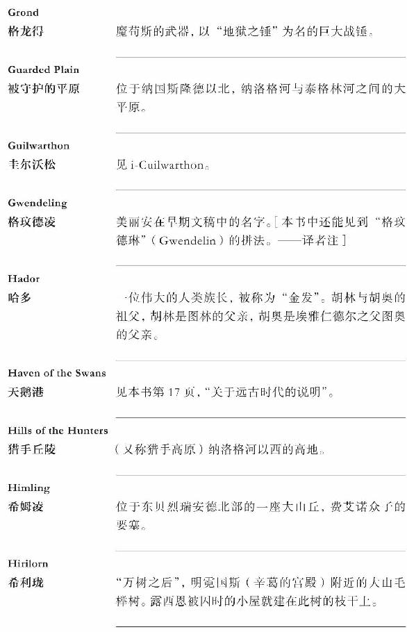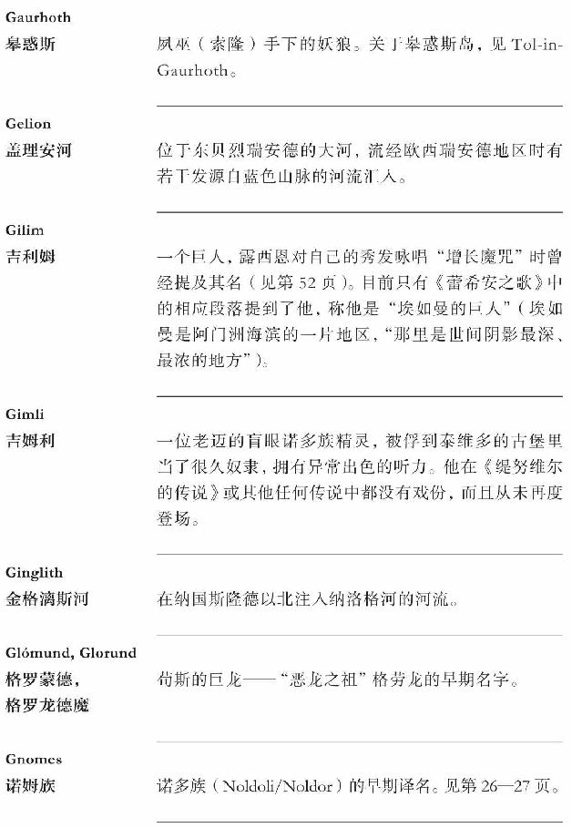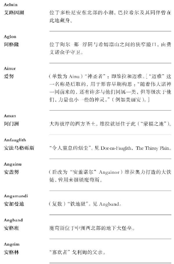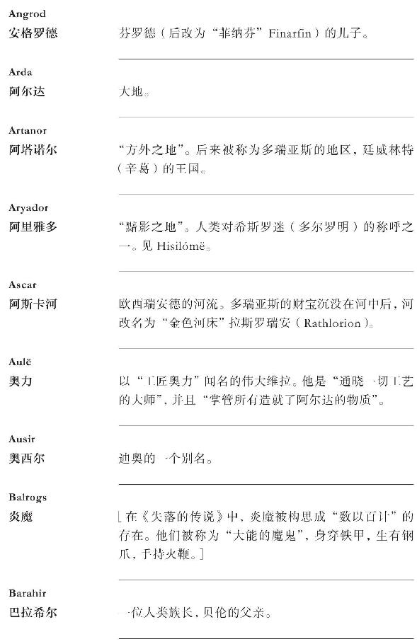对本书来说,这两个目的都绝对不算至关重要。首先,本表旨在协助那些不能从大量名称(以及不同形式的名称)中回忆起某个在故事中可能具有重要意义的名词的读者。其次,某些名称,特别是那些在文本中很少出现或只出现过一次的名称,得到了稍微完整一点的解释。例如,埃尔达“因为乌格威立安提的缘故”(见第38页)不肯碰蜘蛛,这在故事中显然无关紧要,但读者还是有可能想知道这是为什么。
