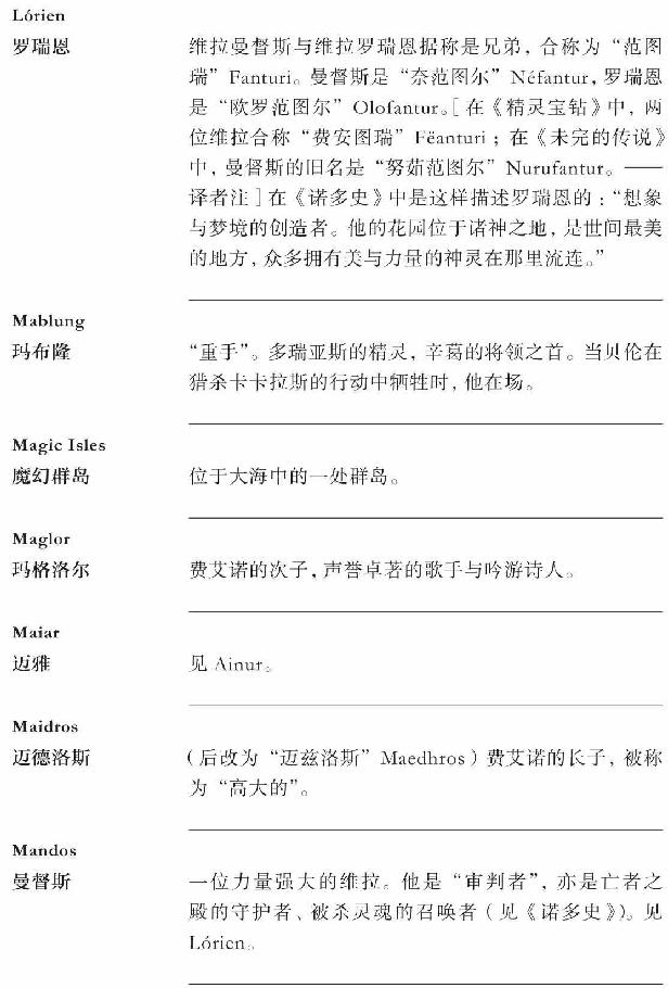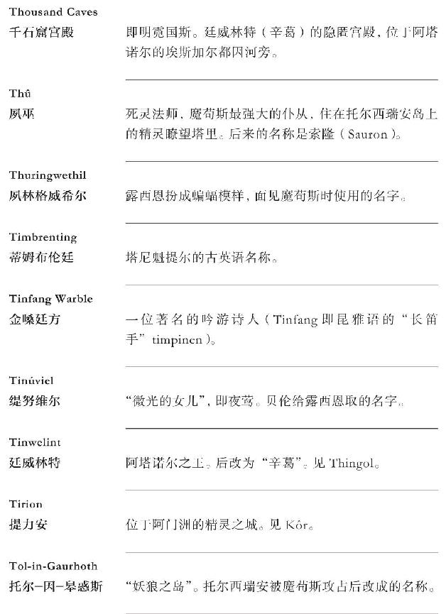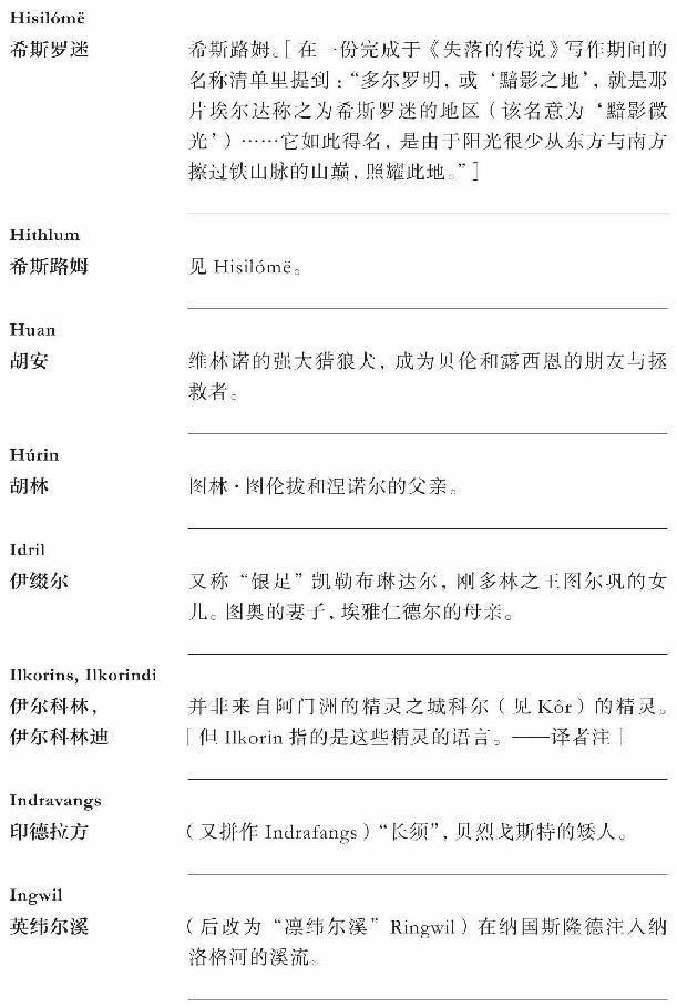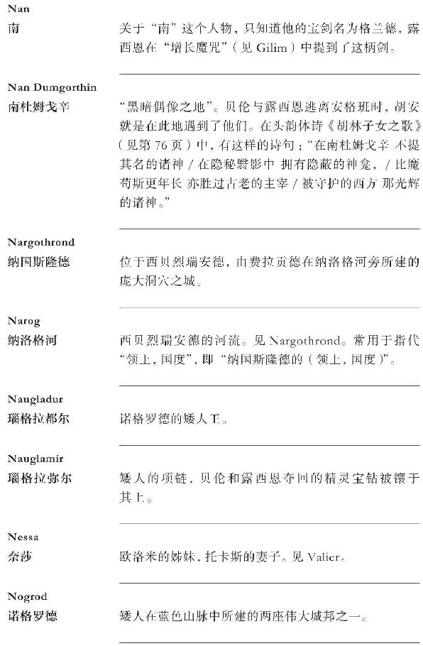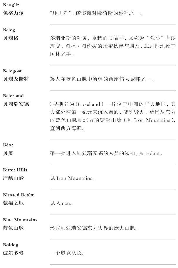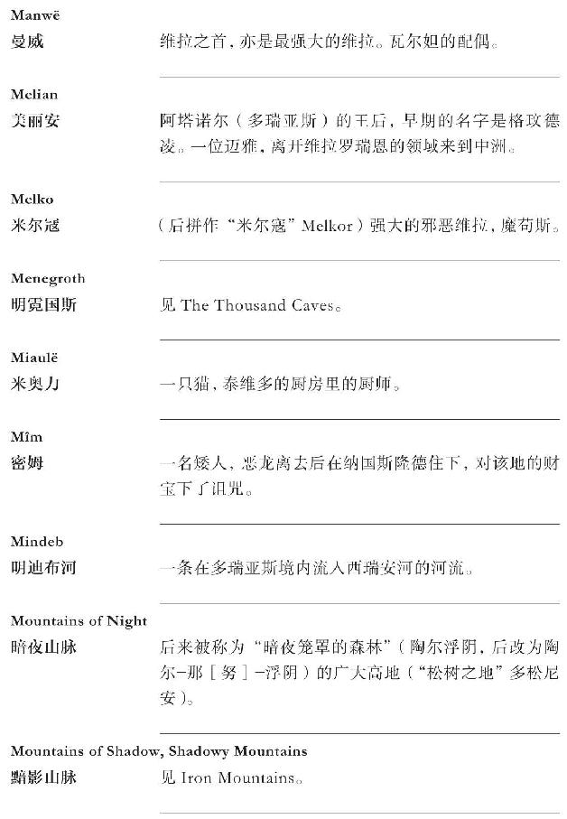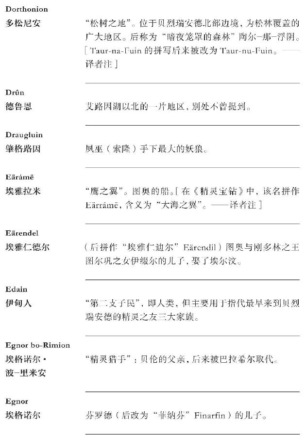 对本书来说,这两个目的都绝对不算至关重要。首先,本表旨在协助那些不能从大量名称(以及不同形式的名称)中回忆起某个在故事中可能具有重要意义的名词的读者。其次,某些名称,特别是那些在文本中很少出现或只出现过一次的名称,得到了稍微完整一点的解释。例如,埃尔达“因为乌格威立安提的缘故”(见第38页)不肯碰蜘蛛,这在故事中显然无关紧要,但读者还是有可能想知道这是为什么。