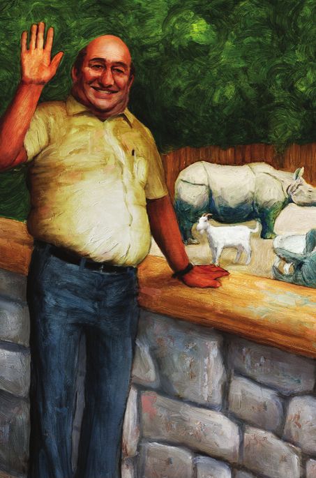 我们来到大型猫科动物——我们的老虎、狮子和豹子——的笼前。他们的饲养员巴布正等着我们。我们走过去,沿着小路朝笼子走,他打开了通向猫科动物笼舍的门,笼舍在一座周围有深沟的小岛上。我们走了进去。那是一座很大的光线昏暗的水泥洞穴,洞是圆形的,温暖潮湿,闻上去有猫尿的气味。周围全是用很粗的绿色铁栏杆分隔开来的高大的笼子。一束发黄的光线透过天窗照射下来。透过笼子出口,我们可以看见周围小岛上的植物,上面洒满了阳光。笼子都是空的,只有一只除外:玛赫沙,我们的孟加拉虎元老,一只体重550磅的瘦长、笨拙的动物被关在了里面。我们一跨进去,他就跳跃着朝笼子栏杆跑过来,发出洪亮的嗥叫声,耳朵紧贴着脑袋,圆圆的眼睛目不转睛地看着巴布。叫声那么响亮,那么凶猛,仿佛把整座笼舍都震动了。我的膝盖开始哆嗦起来。我靠紧了母亲。她也在发抖。甚至父亲似乎也停顿了一下,稳住自己。只有巴布对突然爆发的叫声和像钻头一样直刺向他的灼热的目光无动于衷。根据经验,他对铁栏杆很信任。玛赫沙开始在笼子有限的空间里走来走去。