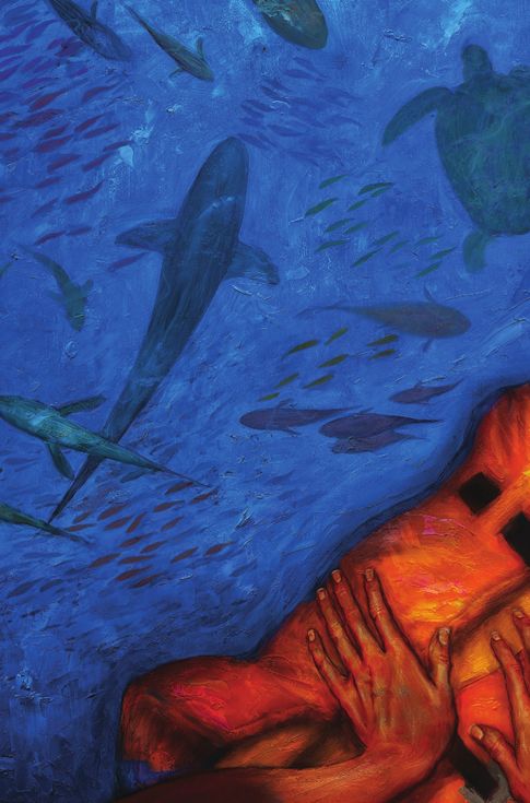 气温渐渐爬升上去。热气变得令人窒息。那天接下来的时间里,我一直都待在顶篷下面的阴凉处钓鱼。似乎抓第一条鲯鳅时,我已经用完了初学者的运气。那一整天我什么也没抓到,甚至在傍晚前海洋生物大量出现的时候也没有。一只海龟出现了,这次是一个不同的种类,是一只绿蠵龟,体型更大,壳更光滑,但是也和玳瑁一样明显地好奇。我没对它怎么样,但却开始考虑应该做点儿什么。
