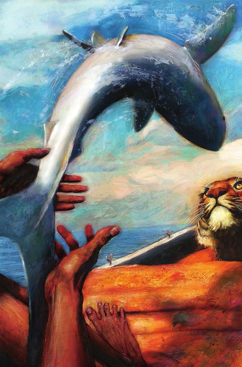 我粗暴地利用了理查德·帕克不能在颠簸的船上行走这一点,但这不是惟一的解释。还有一个解释:我是食物和水的来源。理查德·帕克从记事起就生活在动物园里,他已经习惯了有人把食物送到他嘴边,而他连爪子都不用抬一下。的确,下雨的时候,整条船成了一个接雨器,这时他明白了水是从哪里来的。当我们被一大群飞鱼袭击的时候,我的作用就不那么明显了。但是这些事件并没有改变现实,那就是,当他越过舷边向远处看时,他看不见能够捕猎的丛林,也看不见能够自由自在喝水的河流。而我却带给他食物,带给他淡水。我起着纯粹的奇迹般的作用。这给了我力量。证明:一天又一天过去了,一个星期又一个星期过去了,我还活着。证明:他没有袭击我,即使当我在油布上睡着的时候。证明:我现在正在这儿告诉你这个故事。
