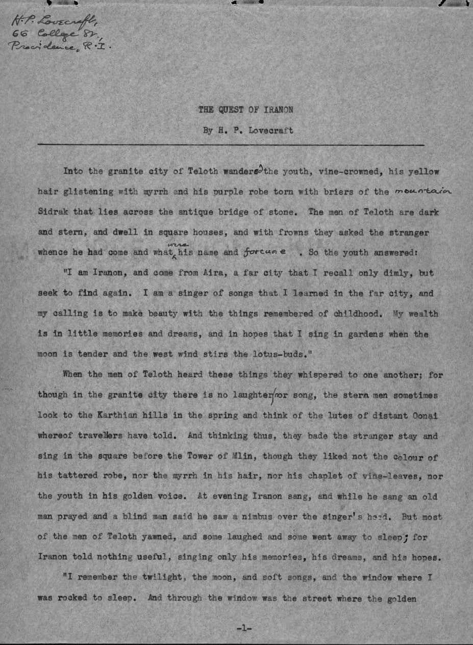 这篇写于1921年2月的《伊拉侬的探索》,被誉为是洛夫克拉夫特“邓萨尼式”作品中最深刻的一篇。作者曾在信中写道:“最近我在尝试一种新的写作形式,用悲伤的词句描绘出恐怖的情节。迄今为止,我最成功的一次尝试就是《伊拉侬的探索》。”但仅仅几年后,洛夫克拉夫特又转而批判自己的这篇文章“其寡淡无味又令人作呕”。事实上,这篇作品是对新教基督徒的伦理进行了尖刻的讽刺,小说里描绘了一座城市,里面的人们(即清教徒)工作的目的只是为了更多地工作。本篇小说完成十余年后才得以面世,首次发表在《帆船》杂志(Galleon )的1935年7月和8月刊上。