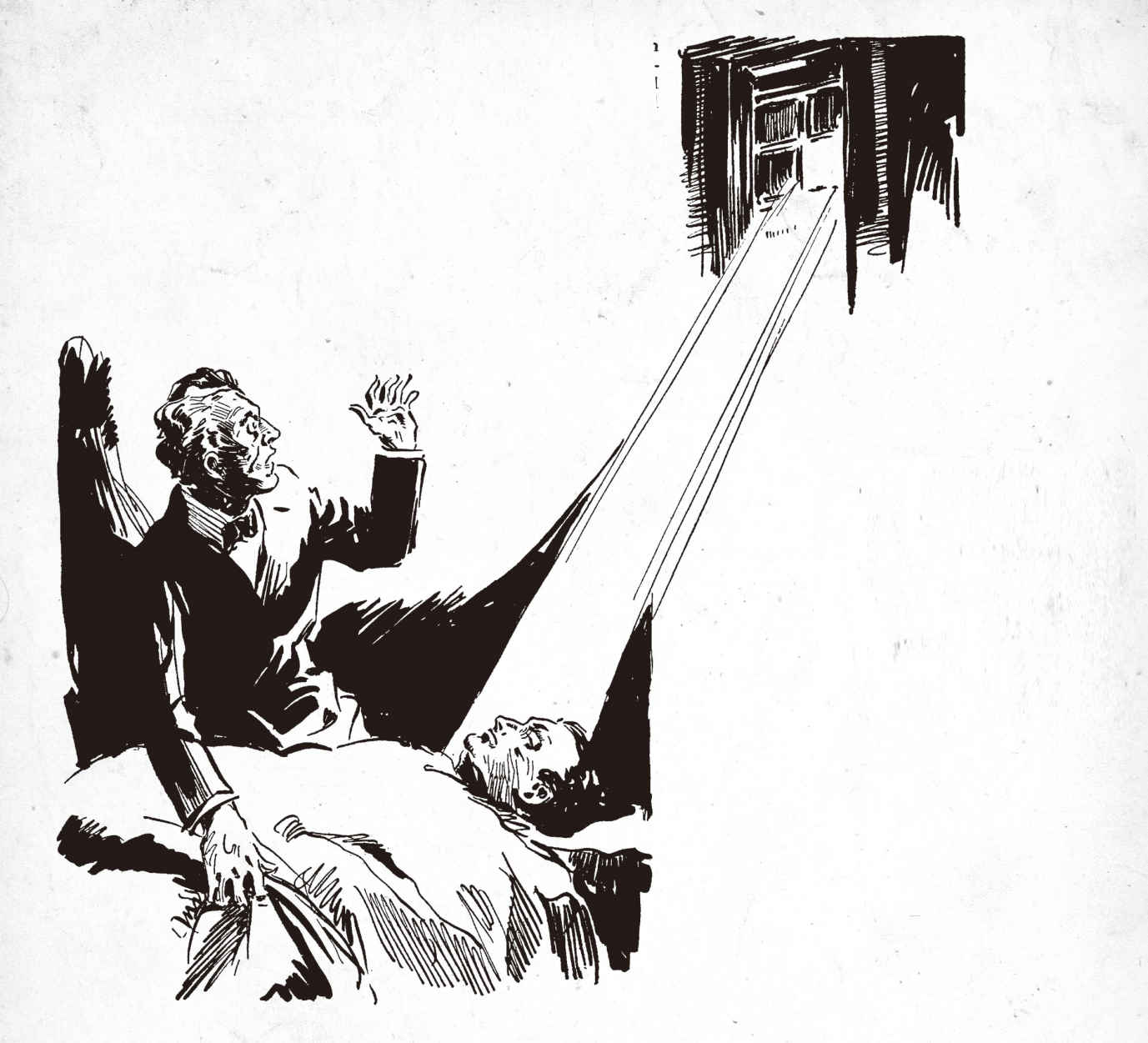 他睁开了双眼,只见那双眸子乌黑深邃、炯炯有神,我虽从未有过什么朋友,但自那时起我便知道他将成为我唯一的朋友。那双眸子必能越过俗念与现实,看透那方世界的华丽与恐怖。我曾在幻想中将那世界视如珍宝,却遍寻无果。驱散围观人群后,我强烈要求他跟我回家,作我的老师,在未知的隐秘中引导我前行,而他未发一语,只默认了。后来我发现,他的声音极为动听,犹如低音六弦提琴与水晶球的敲击声交织而成的乐曲。我们总是秉烛夜谈,白日里我则独自雕琢他的塑像,还在象牙上刻他的肖像,试图将他那独特的气质永存。