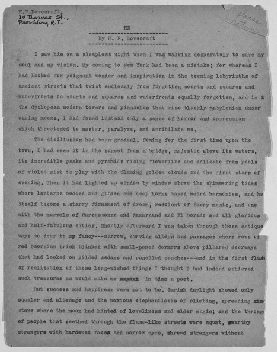 遇见他,是在一个不眠的夜晚。那时我正绝望地游荡在城里的街道上,试图挽救自己的灵魂与梦幻。来到纽约是个错误的决定。这座城市里的古老街道没完没了地蜿蜒扭曲,连接了无数早已被人们遗忘的庭院、广场与码头,而那些巍峨的现代高塔与尖顶则如同巴比伦城一般阴森地耸立在亏缺的月亮下。虽然我也曾在那些街道交汇的拥挤迷宫里寻找过令人酸楚的奇迹与灵感,但置身在新月下的高塔尖顶之间时,我只感受到一种恐怖而压抑的感觉,这种感觉恐吓着我,威胁要彻底掌控我,禁锢我,消灭我。