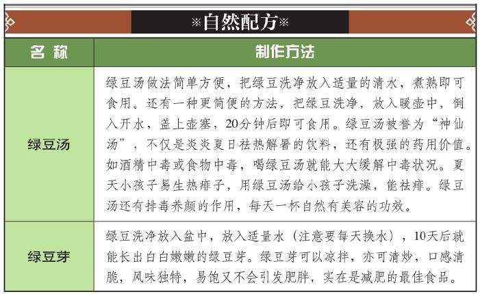 绿豆处处都可以种植,每年三四月下种。长成时苗也不过才1尺左右高,叶子小小的,上面长着小绒毛,到秋天才会开花,花也很小,绿豆的豆荚和赤豆荚十分相似。由于绿豆成长期较长,早些种或晚些种都会有一定的收获。但收割早种的叫摘,意思是可以多次获取;而收割晚种的叫拔,意思是一次性拔掉。颗粒饱满并且颜色鲜亮的叫作官绿,颗粒较小而颜色深重的叫油绿,两者相比官绿的营养较为丰富。北方人食用绿豆的方法特别多,可以炒绿豆吃,做绿豆粥、绿豆饭,用绿豆酿酒,把绿豆做成粉丝,还可以把绿豆磨成面粉做成绿豆糕。最妙的是可以把绿豆用水浸泡,让它长出嫩嫩的白芽——绿豆芽,是很好的蔬菜。在牛马的饲料中添加一些绿豆,可使牛马膘肥体壮。绿豆真的是一种很好的粮食。