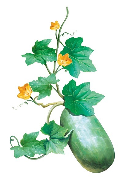冬瓜在三月份会长出苗和蔓,叶子又大又圆,有一个小尖儿,茎和叶都有刺毛,六七月会开出黄花,果实很大,有3~4尺长,直径大概有一尺左右。瓜嫩时是绿色的,外面有小绒毛,外皮很厚也很硬,里面的瓜肉又白又肥美。白色的瓜瓤叫作瓜练,像棉絮一样,可以用它来洗衣服。瓜子叫瓜犀,瓜子仁也可以食用。