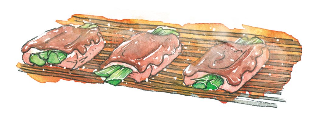 选用半肥半瘦的勒条排骨,抽掉中间的直骨,用葱替换直骨,烧烤时用醋和酱不断地刷在排骨上,不要烤得太干了。