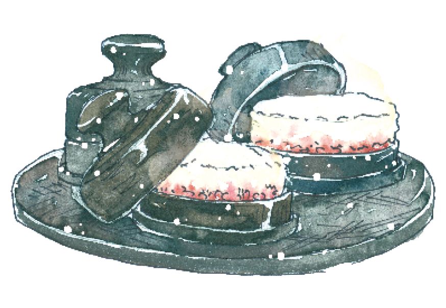 每个锡圈内,将锡钱放置稳妥,先疏松地装一小半粉粒,把果馅轻轻放置在正中,再将粉粒疏松地装满一圈,轻轻拍打使粉粒平整。套在汤瓶上,盖好,看见盖口蒸汽直冒,就可以了。取出来翻扣在盘子里,先去锡圈,再去锡钱,点缀胭脂。两个锡圈交替着使用。汤瓶必须洗干净,里面的水到瓶肩的位置就可以了。然而多次滚沸之后汤水容易烧干,要留心看护,准备好热水不断添加。