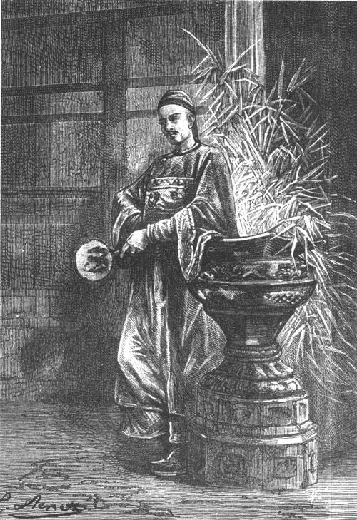 公寓的面积不大,但装饰豪华。落日的余晖反射在蓝色和橙色的窗格玻璃上隐约可见;在飘窗外面,鲜花花环和人造花环在晚风中拂动,五颜六色的灯笼发出柔和的光芒,与即将消失的落日光辉交织在一起,显得格外迷人;窗户的顶部是阿拉伯式的花纹雕刻,这些图案大多是热带的动植物,姿态变幻不定,展现出天堂与人间的种种美景,把人们带进一个幻想的世界里;一把镶着印花细纹布花边的大风扇,悬在天花板上迎风摇摆,给屋子里的人带来凉爽。