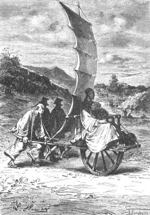 车夫一般是男人,也只能是男人,车子不是按常规那样拉的,而是从后面推的。像双轮双座马车那样,车夫坐在车的后面赶车,并且不妨碍乘客视线。桅杆还可以插上四方形风帆,顺风时产生一种推动力,而且比那些最没忍耐心的旅行者所想象的要大得多,快得多。