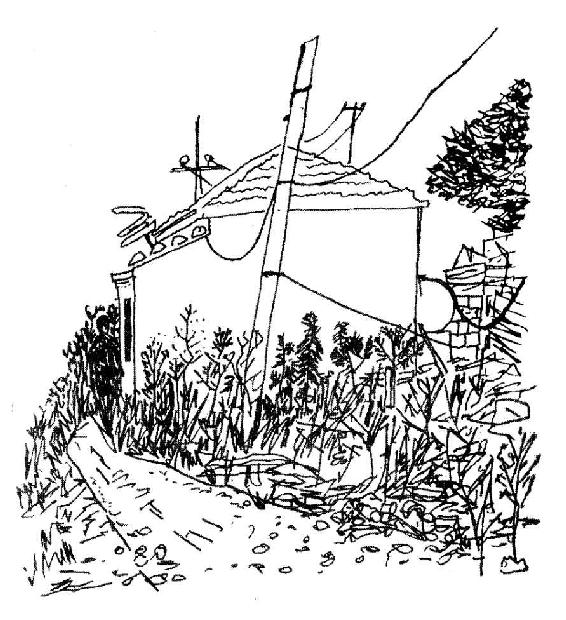人们说,事实上,他的确曾从出生的故乡带来过一些资财,这座房屋就是明证。他用整洁、干净的瓷砖建造屋顶,排列整齐,屋顶的突出部分用上好的白铁皮建造而成,外圈砌以石子固定。走近房屋的后面,你会发现厕所是用干煤球做成的,塑料水箱是后来加上去的。在荆棘、灌木和小松林中,可以看到椅子、木板和一些废弃物。