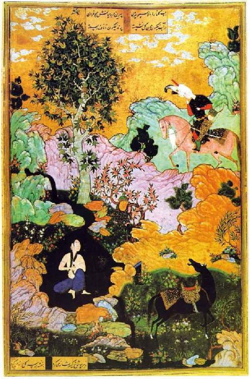 [3]在内扎米写的《霍斯陆与席琳》中,席琳看到沙普尔画的霍斯陆像后,产生思慕之情,便立即骑马赶往波斯,想见霍斯陆。半路上,席琳看到山林间有一湖泊,便下水沐浴。霍斯陆打猎正好经过此外,不经意间瞥见了正在沐浴的席琳。这一场景也成为细这密画家们反反复复描绘的经典场景。