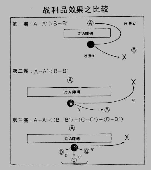 各位在从事缺德活动时,要有成本、利润的观念,设A、B为不同的客体,A’B‘为争取A及B所付出的资源(以下称战费),则客体价值减去战费,即是“战利品效果”。各位勿以成本大而不为,也勿以客体大而必为之,一切全看效果而定,要是发现有别的客体有更好的效果,就应立刻从利如流。请看下图,实心圆即是主体(各位),A价值大于B,主体和A的距离(战费A’)也大于B‘,但是A-A’>B-B‘,是以我们仍舍B而就A。第二图中,A大于B,A’大于B但A-A‘<B-B’,是以我们不被大A所惑,宁可争取小B。第三图中,客体B、C、D相距甚近,一箭三雕自然更好。