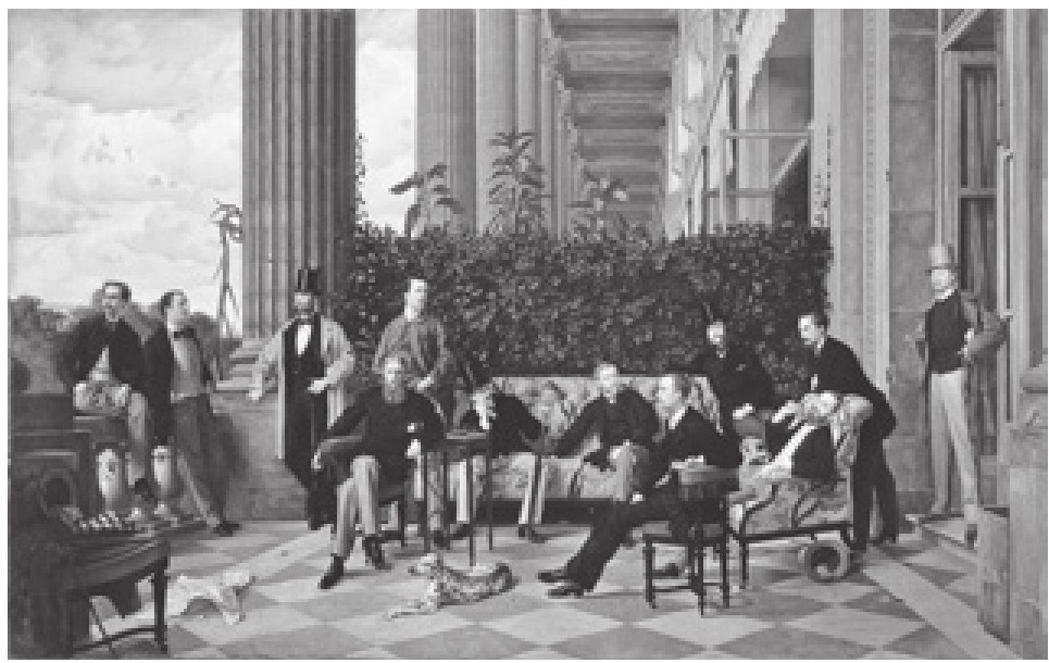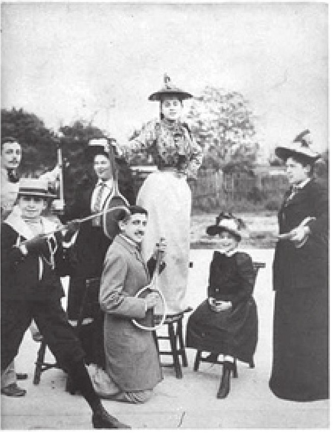 这些日子,装饰艺术博物馆进行了一场“法兰西第二帝国128时期的生活装饰”的展览,六月十日那期的《画报》129刊登了一篇莱昂德尔·瓦扬的《裙衬时期》,翔实而生动地展现了这场展览上的一幅绘画作品——詹姆斯·迪索130的《上流圈》131。如果普鲁斯特的朋友保罗·布拉奇的目光只是扫过这幅画的话,那么这幅画背后的一些逸事于他而言不过是些趣闻罢了。他站在画前良久,看看自己是否能够辨认出这画中两三个人物。其中一个人吸引了保罗·布拉奇的注意力。他和周围其他十一位重要的贵公子一样引人发笑,但他离得稍微有些远,靠近门框,笔挺地站着,唇边留着红棕色的精致小胡子,肩上扛着一根颇像是浪漫派的纨绔子弟用的拐杖,头戴亮灰色的大礼帽。他便是查尔斯·阿斯132,像极了普鲁斯特笔下那永垂不朽的文学形象——查尔斯·斯万。保罗·布拉奇向普鲁斯特模糊地形容了那幅画,倾听中的普鲁斯特没有忽略那些站在玛桑阳台上的贵公子的着装。一个月前,吕西安·都德与他谈论起画中的其他人,例如拉乌侯爵和憨态可掬的埃德蒙·德·波利尼亚克,说拉乌侯爵已经接替了他母亲阿尔方斯·都德夫人在波旁宫学院路四十一号的位置。最后更重要的一点是133,他提及了“阿斯先生特别像斯万”。普鲁斯特很激动,他让塞莱斯特拿来刊登着画的剪报。他现在才认识的这些混迹于上流社会圈、或多或少有些名气的贵公子,却早已预先被写进了书中,尤其是那位有血有肉、真实存在过的阿斯先生。他便是存在于历史中的斯万,那位爱恋着奥黛特的斯万。