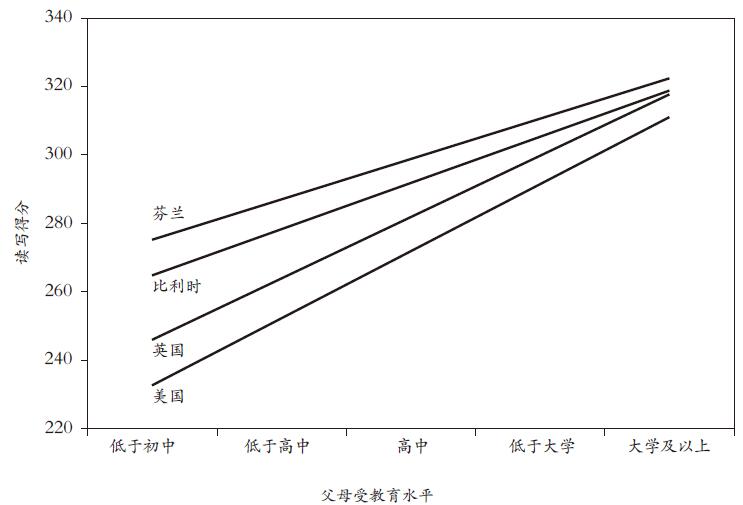 这张图表表明,即使父母受到过良好教育(由此想必具有较高的社会地位),所处国家的整体状况依然会影响到你在教育上是否会获得成功。对于那些社会地位较低、父母受教育水平也较低的人而言,所处国家的整体状况造成的影响就更大了。需要重点指出的是,在这四个国家当中,最为不平等的英国和美国,社会坡度也最为陡峭;更加平等的芬兰和比利时,社会坡度也更加平缓。显然,社会坡度的陡峭程度也会对各国的平均读写得分产生重大影响:美国和英国的平均得分普遍更低。
