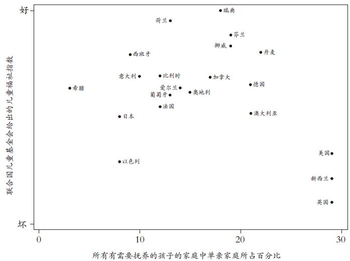 单亲家庭比例与儿童福祉水平之间毫无关联,这表明某些国家的福利制度有助于避免单亲家庭陷入贫困的境地。经济合作与发展组织近来的数据表明,瑞典仅有6%的有工作单亲家庭及18%的无业单亲家庭处于相对贫困的境地;在美国,这一数字分别为36%和92%;在英国,这一数字分别为7%和39%。儿童托管服务使得单身父母可以放心工作,这一因素对于儿童的福祉水平同样至关重要。