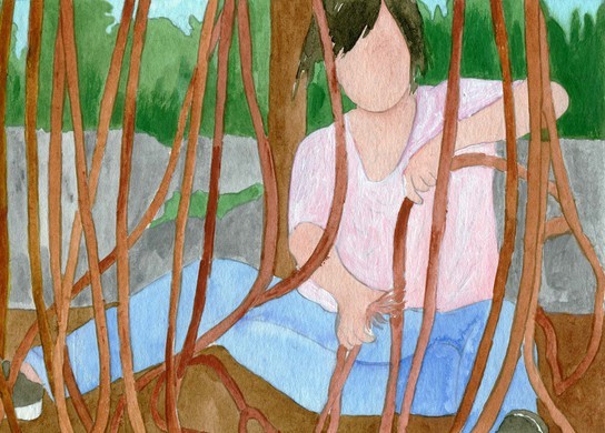 中午,大家都在地下室里坐着休息。想到麻绳并不令人满意的效果,我有点纠结,还是想去调整一下,看麻绳是否能再绷紧些。我从地下室的木板堆里爬起来,跑到地面上去。