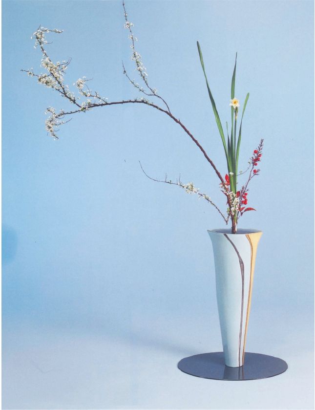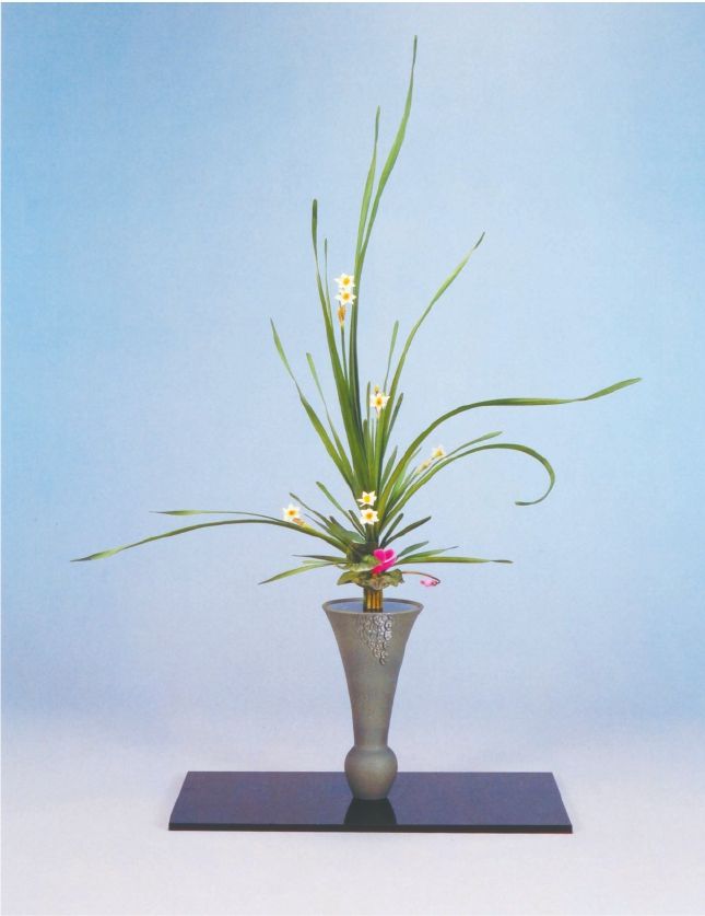 这幅(图四)层层叠叠、错落有致、饱满的插花作品,就是池坊的立花,在花道中这个花型有着自己的名字,叫水仙一色。在这个作品中,我们可以欣赏到水仙那优雅曲直的线条,在整个作品中有秩序地四散开来,犹如一瓶正在绽放的烟火。
