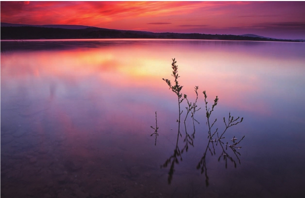 而日暮时分,天空与云彩绽放出橘色的霞光,遇暖而深邃,这种天气色彩的彩度很高。