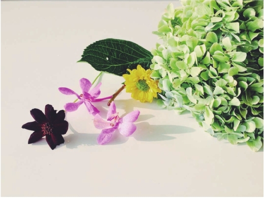 准备花材 波斯菊、石斛兰、黄色小菊花、绣球